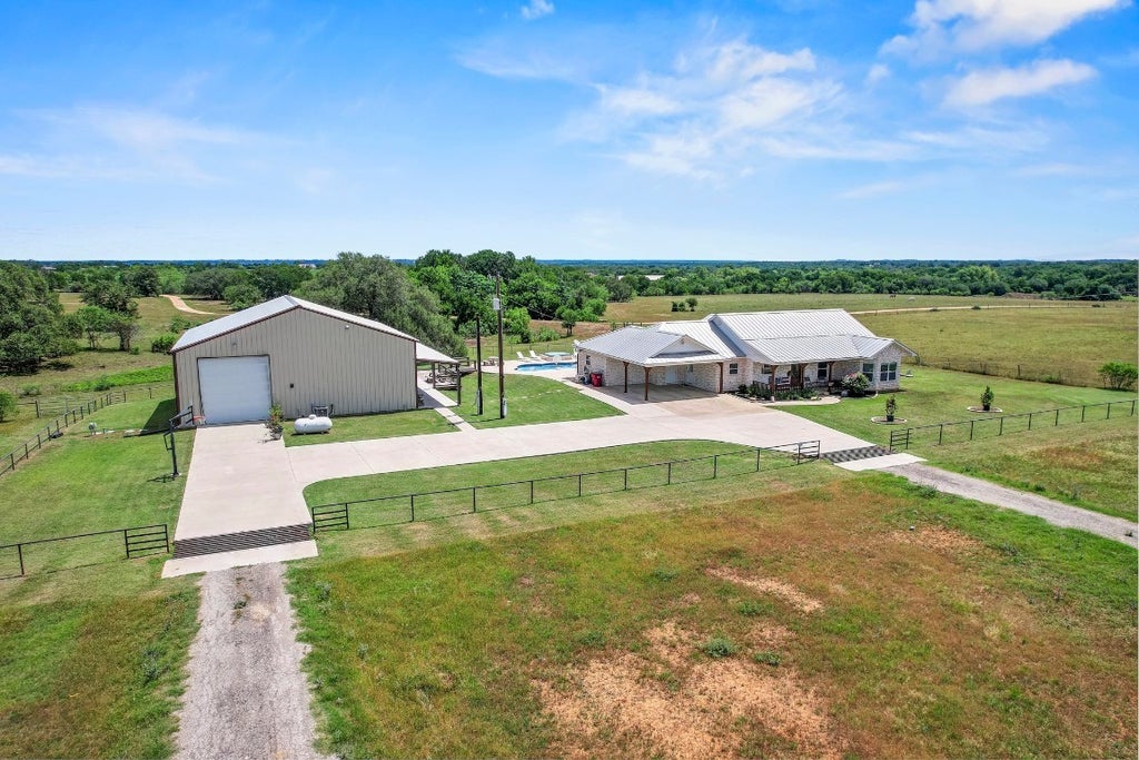 Beautiful 5-acre property featuring two homes with metal roofs and Hill Country views. The main residence offers 3 bedrooms, 2 bathrooms, and 1,996 sq ft. Features include hardwood floating floors, an open-concept layout, spacious bedrooms, custom natural wood cabinetry with pull-out shelves, large laundry room, and a primary bath with dual shower heads. Additional highlights: jumbo water heater, wired sound system (interior and exterior), and outdoor pool area with large deck and covered entertainment space with TV. The second structure is a barndominium with 1 bedroom, 2 full bathrooms, living room, dining area, and game space—suitable for guests, rental income, or party barn use. Propane services the gas cooktop and water heater. Attached 1,250 sq ft of insulated storage is designed to accommodate a 40-foot motorhome with 50-amp power, water/sewer hookups, or workshop use. Refrigerator conveys; washer/dryer hookups included. Property also includes a well-maintained barn for livestock, horses, or storage. Conveniently located near Tesla, Starlink, The Boring Company, and Austin-Bergstrom International Airport. This property offers privacy, functionality, and excellent potential. A must-see!