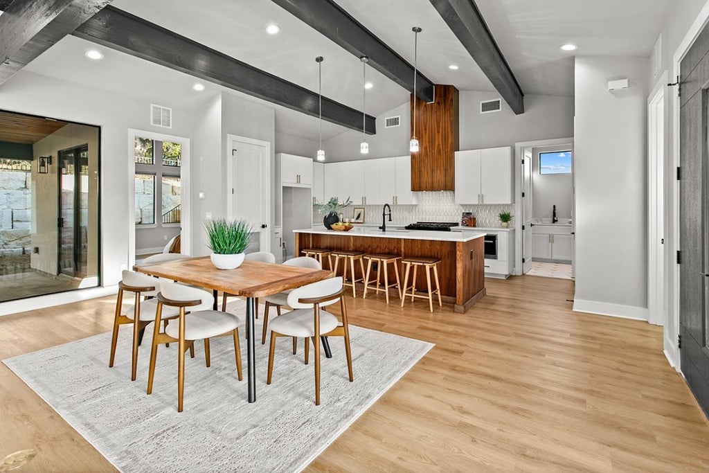 This Eichler inspired single-story mid century home captures true indoor-outdoor living with clean architectural lines, walls of glass, and designer finishes. The 2,667 sq ft main home offers three bedrooms with their own ensuite bathrooms, an office, and a second living area, while a 528 sq ft detached casita on the hill behind it includes its own kitchen/living space, bedroom, and full bath which is ideal for guests, a creative studio, or future pool house. The open layout with beamed ceilings, and light oak colored LVP connects a great room with fireplace to a beautiful kitchen featuring quartz countertops, a large island with bar seating, ZLine gas range, and huge walk-in pantry. Natural light floods the space through expansive windows on two sides, highlighting designer tile, and a seamless flow between living, dining, and outdoor areas with three separate sliders. The primary suite features large windows, private patio access, and a spa-style bath with soaking tub, glass shower, dual vanities, and walk-in closet. Each secondary bedroom includes a private ensuite bath. A covered back patio opens to a small yard with stairs leading to the upper yard and casita. The cul-de-sac lot offers privacy, and the casita’s fenced gate opens onto Caliterra’s walking path. From its hilltop porch and guest house living room, enjoy Hill Country sunset views framed through the oaks. Additional highlights include a three-car detached garage with breezeway and a mudroom with drop zone. Residents enjoy resort-style amenities: clubhouse, pool, Sonder Coffee shop, parks, and miles of trails along Onion Creek—all near top-rated Dripping Springs ISD schools. Call today to schedule your tour of this unique home!