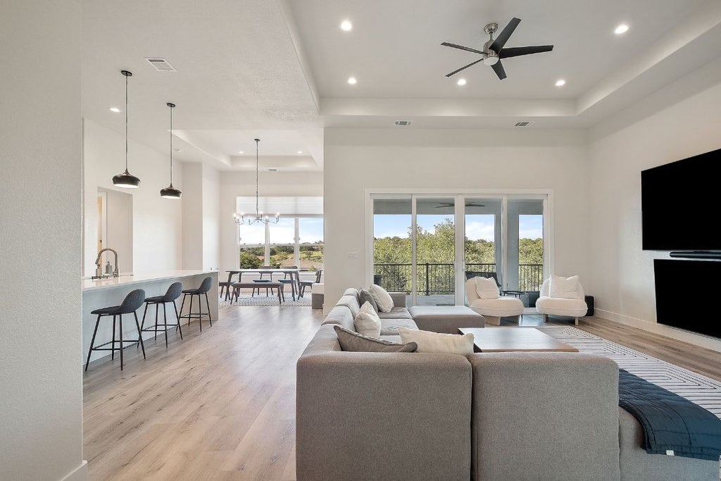 Sweeping views for miles in Lago Vista. A fresh, stellar one-story floor plan with stunning high ceilings and water access awaits you. Elevated with numerous upgrades including a waterfall island, extending the luxury vinyl to each room, epoxied garage, custom window treatments, and beautiful new lighting fixtures, this home brings all the relax-in-luxury vibes to your doorstep. This million-dollar-view home was built for entertaining. With a huge outdoor patio for spectacular panoramic views from the expansive living area and primary bedroom and an extra large yard with plenty of room for a pool and vegetable garden, this open-floorplan home is a standout in every way. Flowing into both the kitchen and dining spaces, the family room measures almost 30x22 ft, opening out onto the sliding door balcony. Large closets for every room abound. Furnished option available. For furnished option, contact agent for more information and pricing details. Be at peace in this private and serene neighborhood, with deer that roam and beautiful rolling hills that take you down toward the water, just minutes away. Enjoy your time on the water as a member of the Lago Vista HOA, with amenities including 9 parks, a campground, marinas, boat ramps, a swimming pool, tennis courts, a fitness center, pickleball courts and so much more. This is truly lake life at its finest.